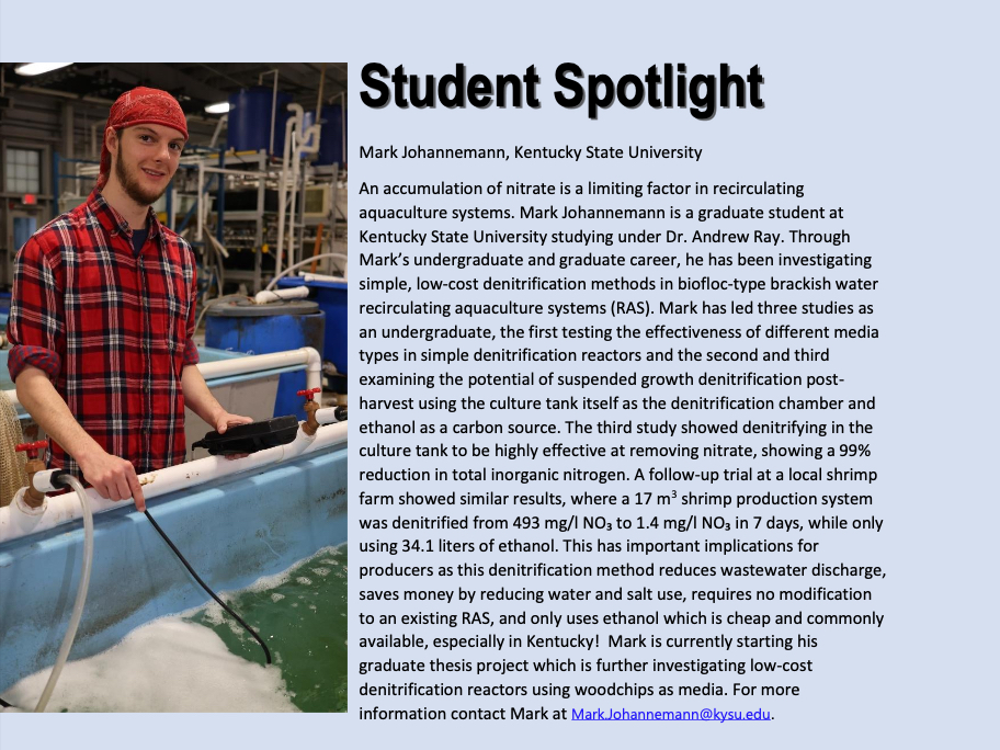 We are delighted to announce that Ashton Schardt has been selected as the recipient of the 2024 Outstanding Graduate Student of the Year Award. This prestigious accolade is determined annually by the Aquaculture Faculty, with input from various factors such as academics and leadership. Under the guidance and mentorship of Dr. Rossi from the Aquaculture Research Center Nutrition Lab, Ashton has displayed exemplary dedication and commitment to his studies. His impressive academic achievements and passion for the field of aquaculture have set him apart as a deserving candidate for this recognition. Furthermore, Ashton's active involvement in the AQUACULTURE AMERICA Student Sub Unit and his participation in other student activities have showcased his exemplary leadership skills and commitment to contributing to the academic community. His thoughtful attention to detail and diligent work ethic have greatly enriched the programs and initiatives at KSU and the Aquaculture Research Center. We extend our warmest congratulations to Ashton Schardt for this well-deserved honor and commend him for his outstanding contributions to the field of aquaculture.
