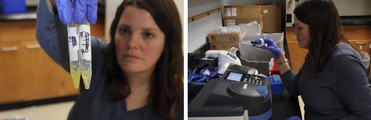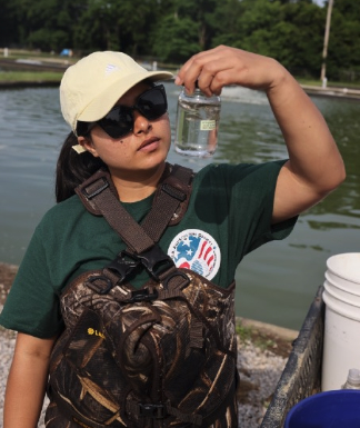 Sandhya Lamichhane’s research will document food availability, and selectivity of phase I largemouth bass in nursery ponds and raceways with a managed bloom. A bloom in ponds refers to an excessive growth of algae or other microscopic organisms, such as phytoplankton, that can cause the water to appear green, brown, or red. These blooms are often visible on the surface as a dense layer or scum. Sandhya will compare zooplankton abundance in managed nursery ponds and stomach contents of phase I LMB in both ponds and floating raceways.