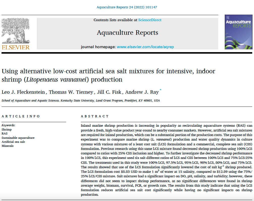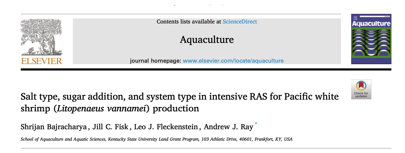 The Ray Lab published a new manuscript in the prestigious journal Aquaculture. The paper is the result of Shrijan Bajracharya’s thesis research here at KSU with marine shrimp. It details an experiment that examined the effects of an in-house made sea salt compared to a commercial salt, the effects of clear-water culture systems versus more turbid systems, and the addition of sugar as a bacterial carbon source versus no extra carbon addition.