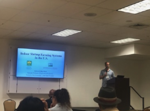 Dr. Ray traveled to the inaugural Florida Shrimp Summit in Fort Pierce, Florida. He gave a presentation titled "Indoor Shrimp Farming Systems in the U.S." which covered several different strategies and technologies that can be used to successfully grow shrimp indoors. Some of the information was gathered from a comprehensive survey of U.S. shrimp farms that Dr. Ray conducted, other information he had gathered by visiting farms across the world and conducting state- of-the-art research right here at KSU. There were about 50 people in the audience and they had a very positive reaction to Dr. Ray's presentation. This is another example of the many ways that KSU Aquaculture is reaching a broad set of constituents to deliver impactful information that helps drive the aquaculture industry forward.