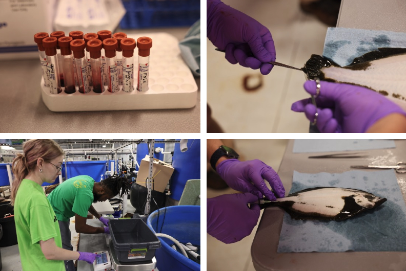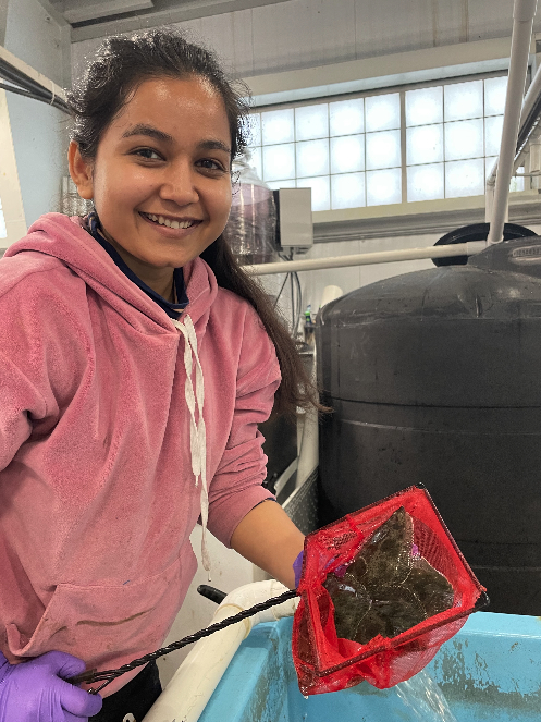 Ms. Sagun Chhetri conducted a sample of her research project with the assistance of Dr. Ray and his crew, focusing on the growth of flounder under varying stocking densities. The results may indicate that flounder exhibit superior growth in low stocking density conditions, with a current average weight exceeding 300 grams, followed by medium and high densities. Overall, the survival rate has been satisfactory, with minimal instances of mortalities observed thus far. The projected completion date for Ms. Chhetri's research is approximately in the middle of June 2024. At harvest, Sagun will obtain her last sample to evaluate fish growth and extract blood samples for analysis. Regarding the extraction of DNA from fin clips, the objective is to examine whether genes associated with stress exhibit greater expression in fish reared under high stocking density compared to those in low density tanks.