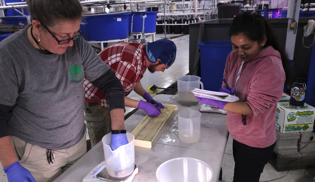 Sagun and the team received approximately 2,000 fish from the University of Miami and raised them in nursery tanks for about three months. They then stocked the new tanks at three different commercial-level densities: 2.7, 5.4, and 8.1 kg/m2 to make the three treatments which include three replicate tanks each. Sagun will be measuring growth, biomass, survival, FCR, as well as comparative levels of cortisol, glucose, growth hormone, and insulin-like growth factor-1 in the fish blood. This work will be used to help determine the suitability of olive flounder in RAS so that domestic farmers may have new and valuable fish species to help expand U.S.